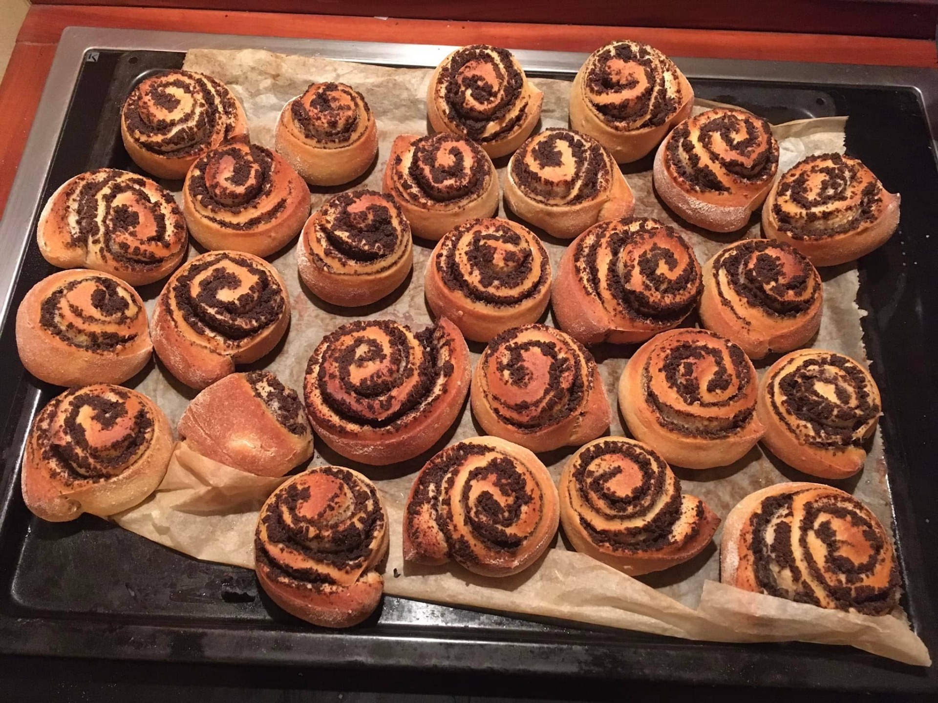 - Nakynutá těsto rozdělte na 2 půlky, rozválejte a pomažte rovnoměrně ještě vlažnou náplní. Srolujte a nakrájejte 24 šneků. Položte je řezem na pečící papír a nechte dokynout 1,5h.